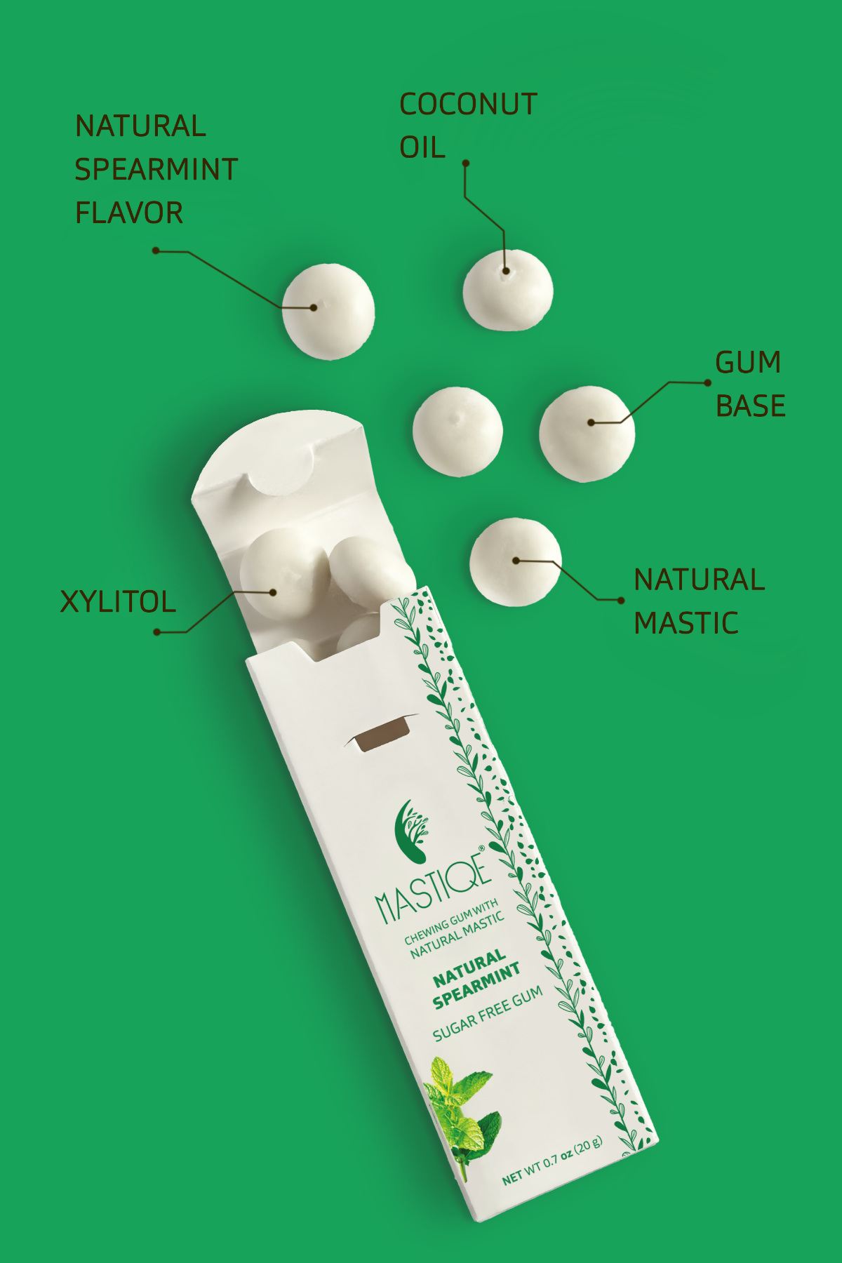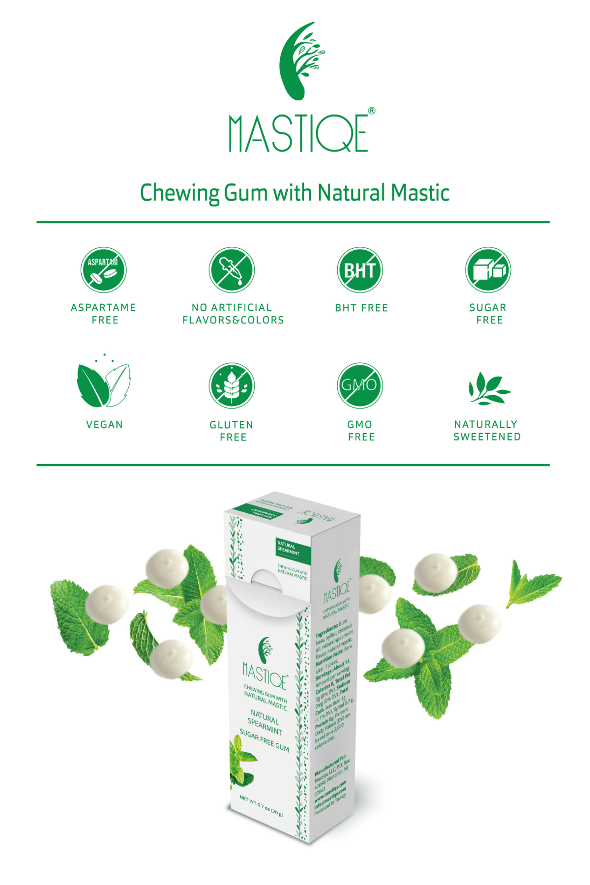 Mastiqe is sugar-free and naturally sweetened with xylitol, natural spearmint, and pure mastic. Vegan, non-gmo, and gluten and aspartame free.