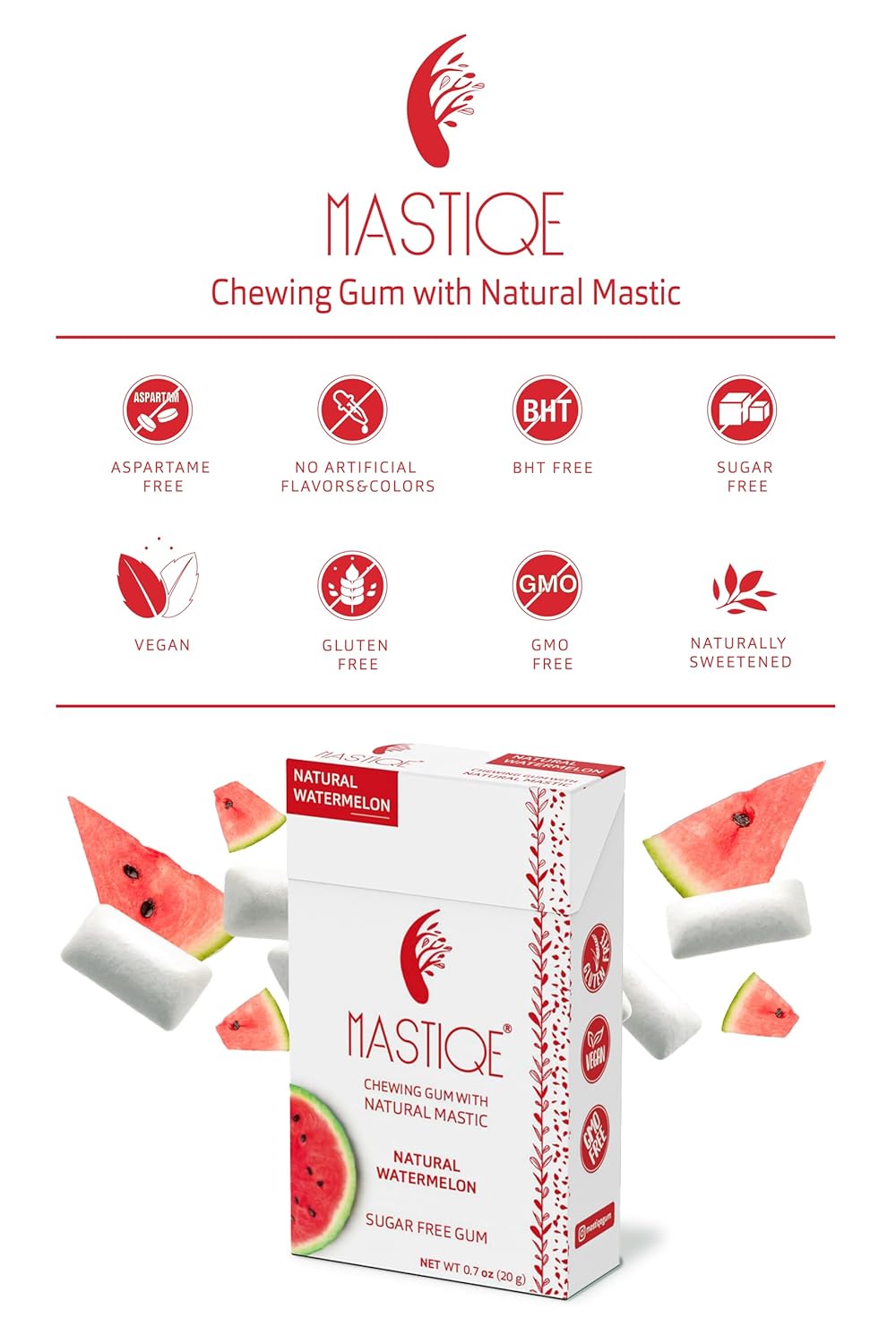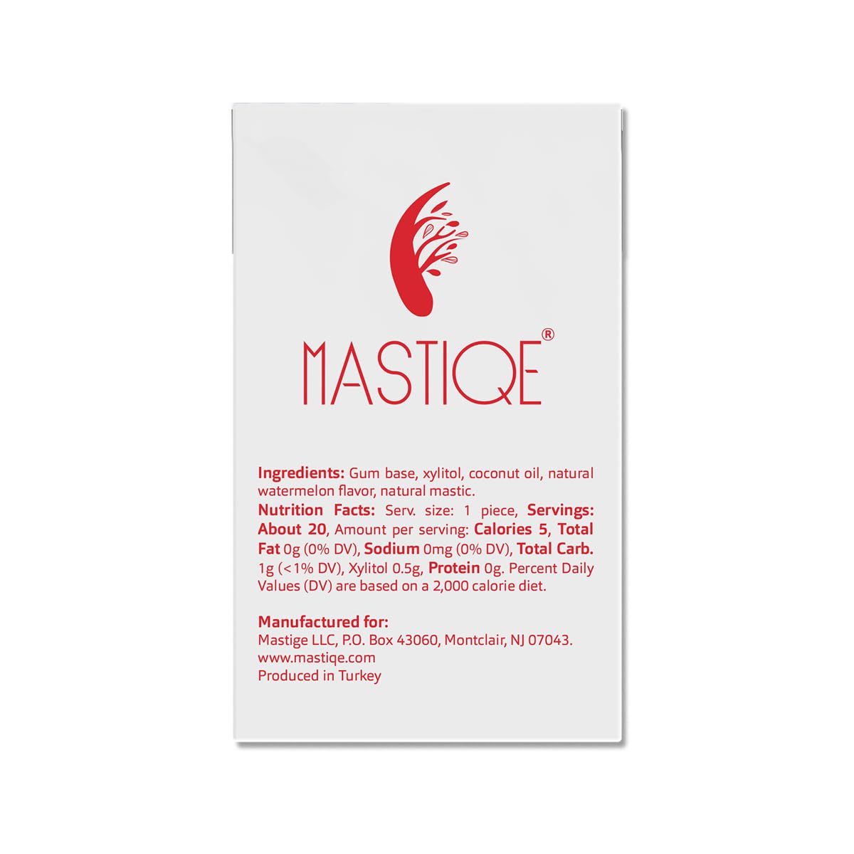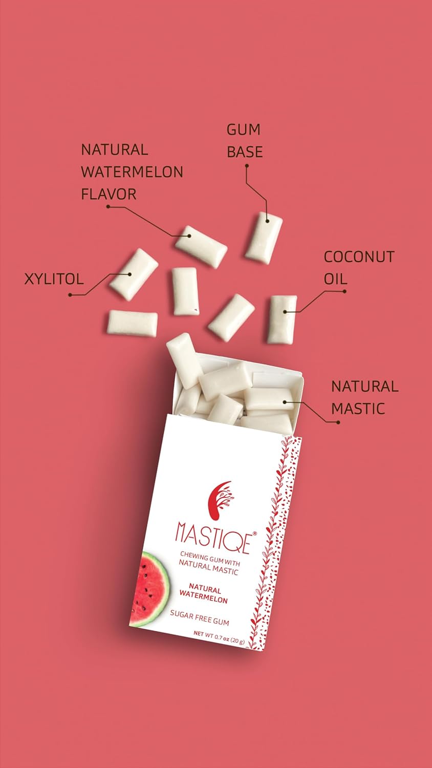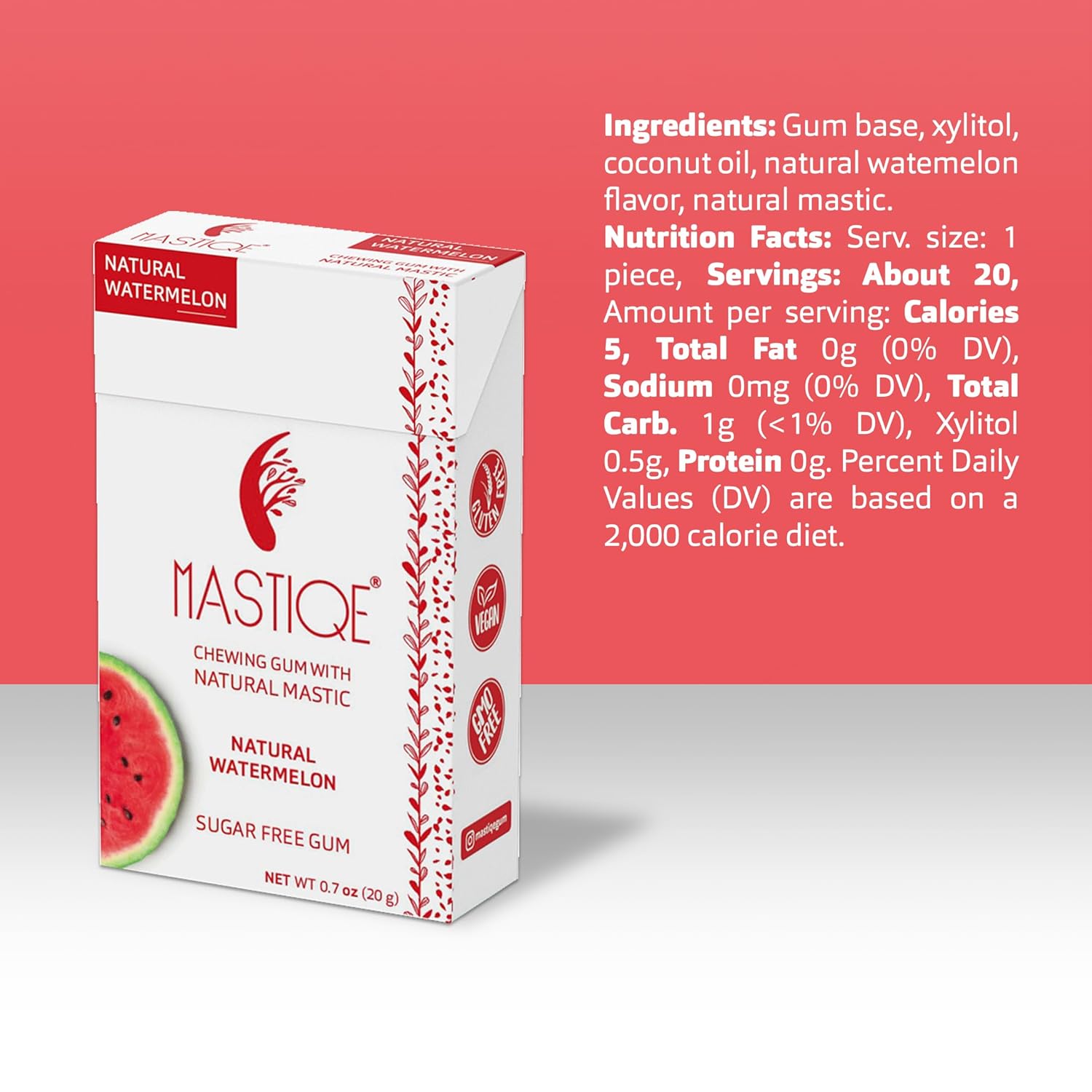 Mastiqe is sugar-free and naturally sweetened with xylitol, natural watermelon, and pure mastic. Vegan, non-gmo, and gluten free, aspartame free, BHT free.